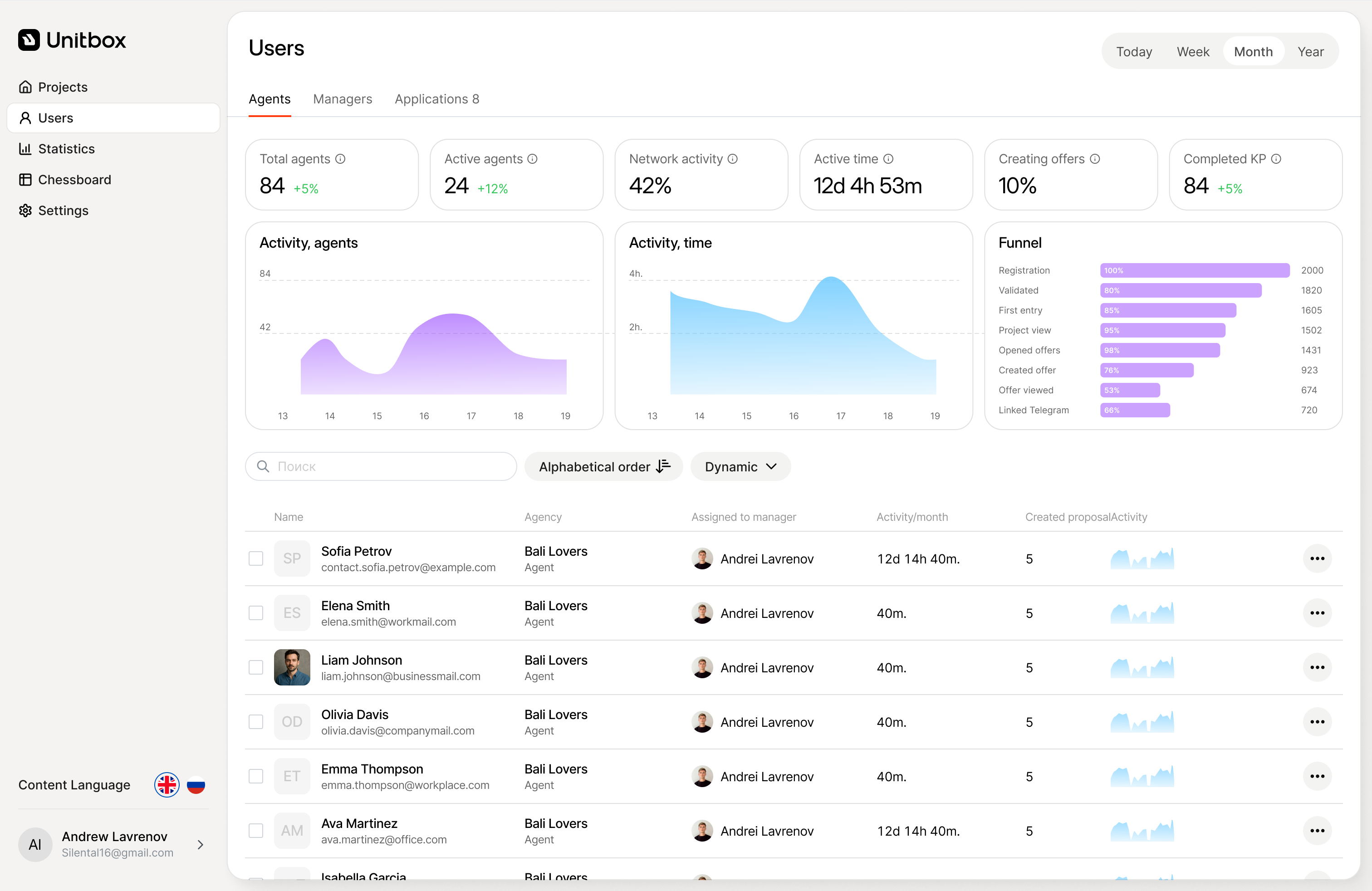 Unitbox helps organize work with agents from scratch. You don't need a large team — the portal takes load off managers.