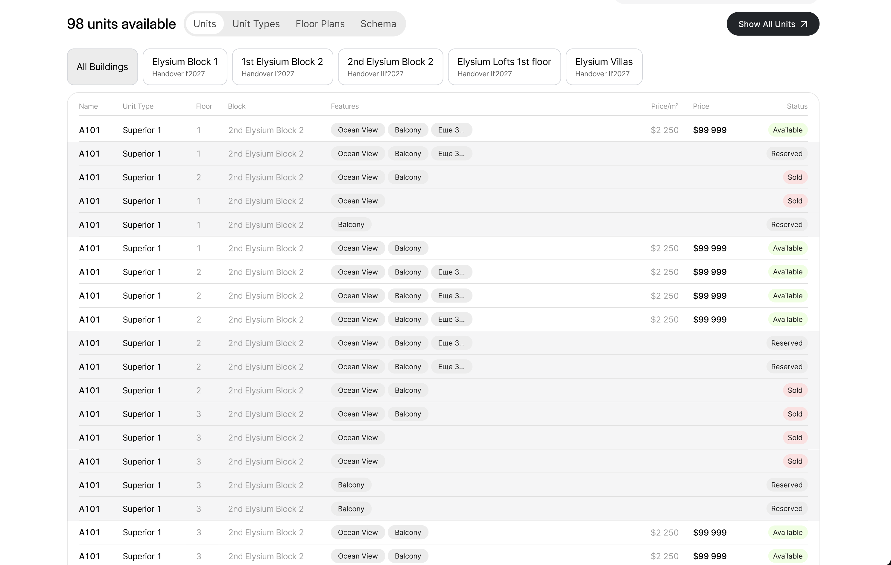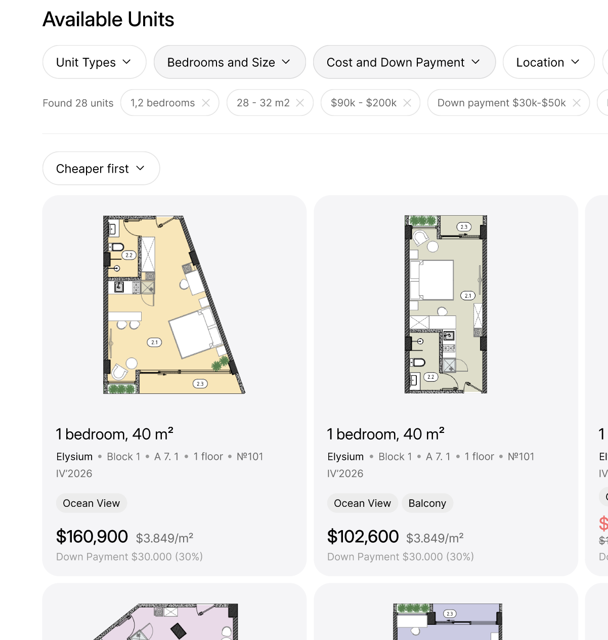Upload a project and all agents immediately see current info: prices, statuses, floor plans, renders. No more sending Excel via chats and answering "what's the price for this unit?". Agents only see available units. Sold and booked ones are automatically hidden or marked. No risk of offering what's already sold.